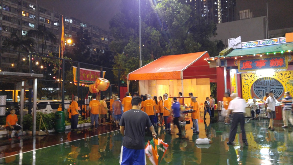 他們在十五晚上八時開始請神,分別是白田街山坡從前的觀音廟、南昌戲院大廈的辦事處及呈祥道福德祠。今年好像有點延誤,八時出發,到差不多11時,遊樂場燈都熄了,才請齊三個神回到場地。